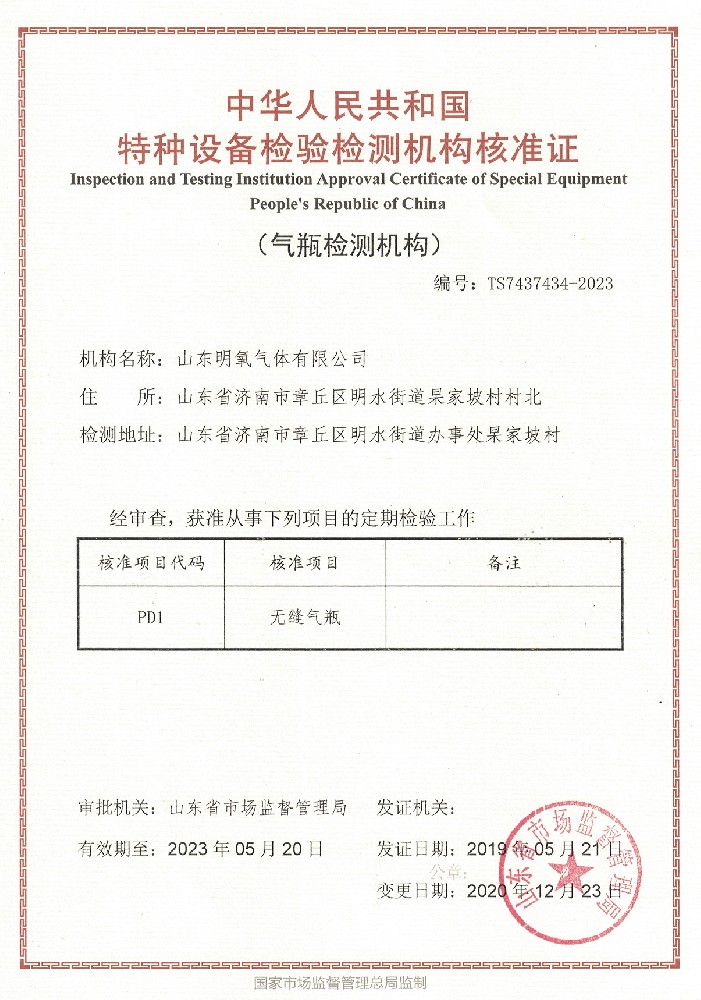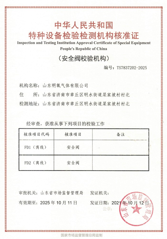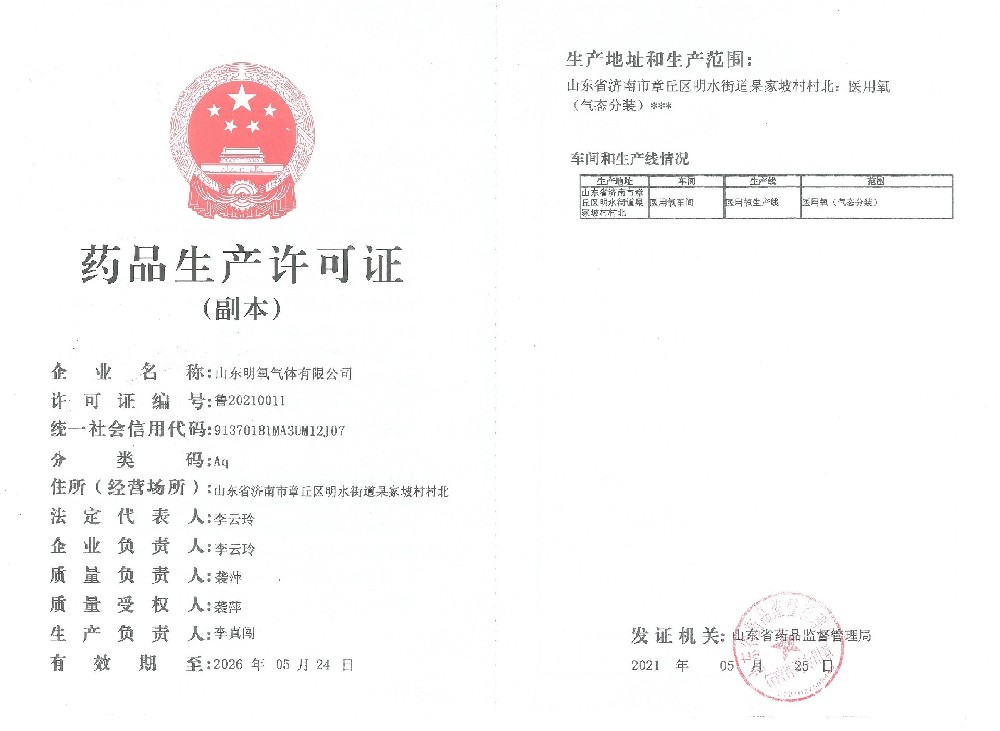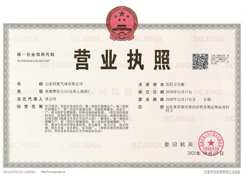 ??? 山東明氧氣體有限公司的前身為始建于1993年的章丘市明水氧氣廠,2020年12月企業(yè)由民營獨(dú)資轉(zhuǎn)型升級為山東明氧氣體有限公司,企業(yè)進(jìn)入新的發(fā)展階段。公司位于山東省濟(jì)南市章丘區(qū)明水街道杲家坡村村北,占地面積4000平方米,注冊資金500萬元,固定資產(chǎn)投資3000萬元,主要經(jīng)營項(xiàng)目為醫(yī)用氧氣、工業(yè)氧氣、氮?dú)狻⒏呒兊獨(dú)?、氬氣、高純氬氣、高純氦氣、二氧化碳、混合氣體等各種工業(yè)氣體、高純氣體、混合氣體的充裝銷售、各類氣瓶的銷售、安全閥校驗(yàn)、鋼質(zhì)無縫氣瓶的檢驗(yàn)等。